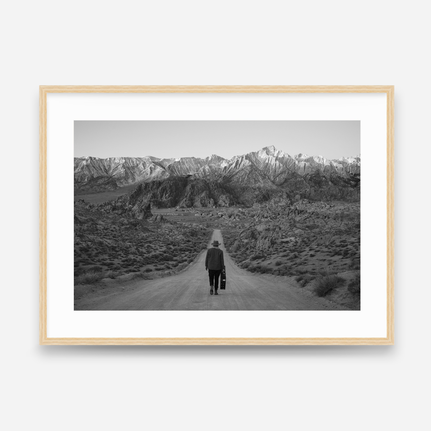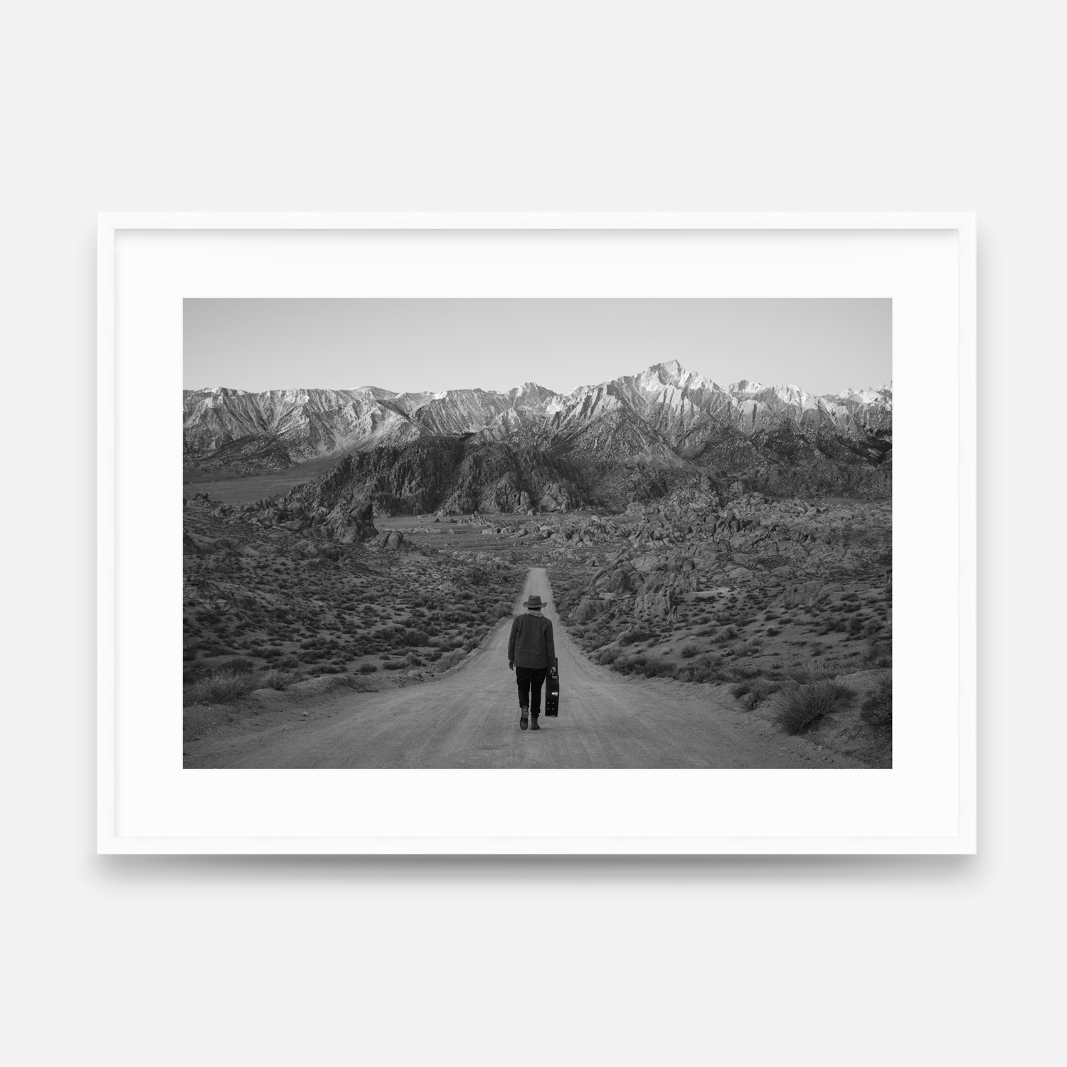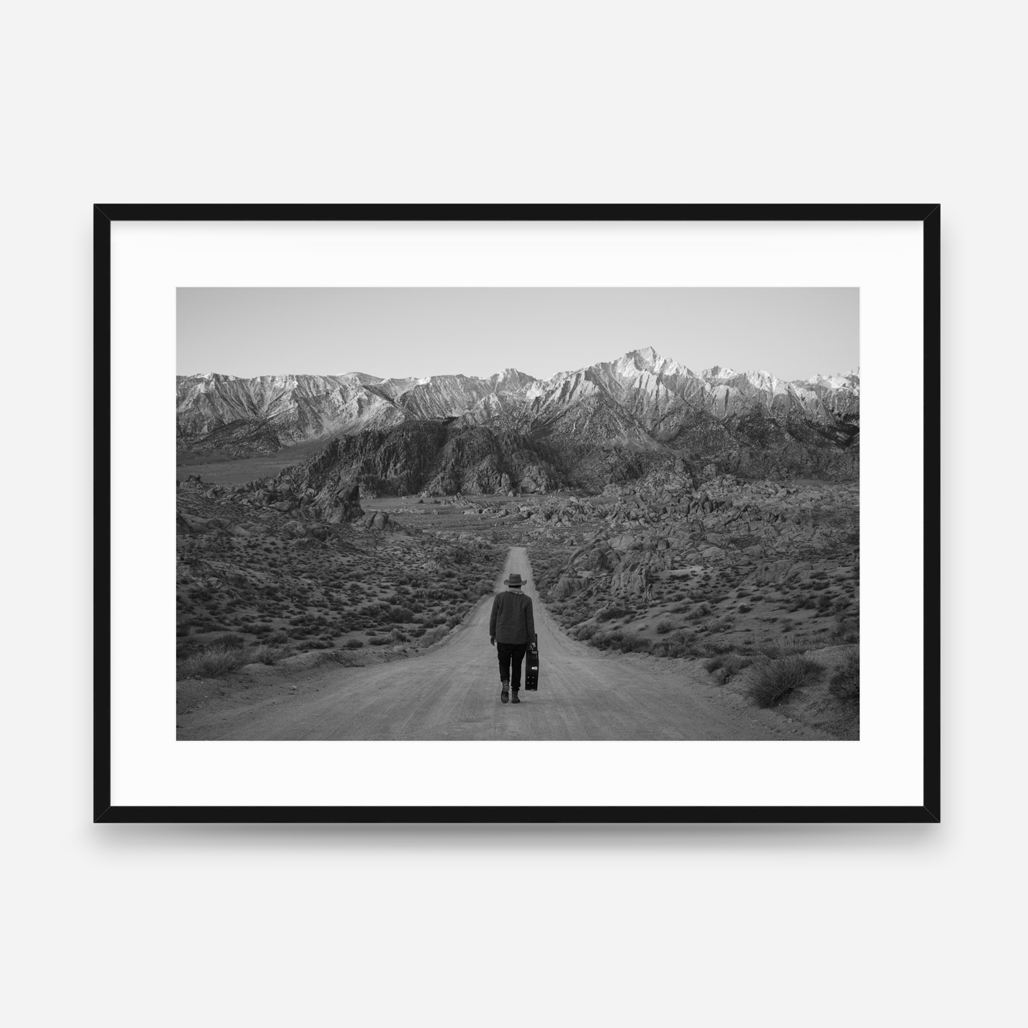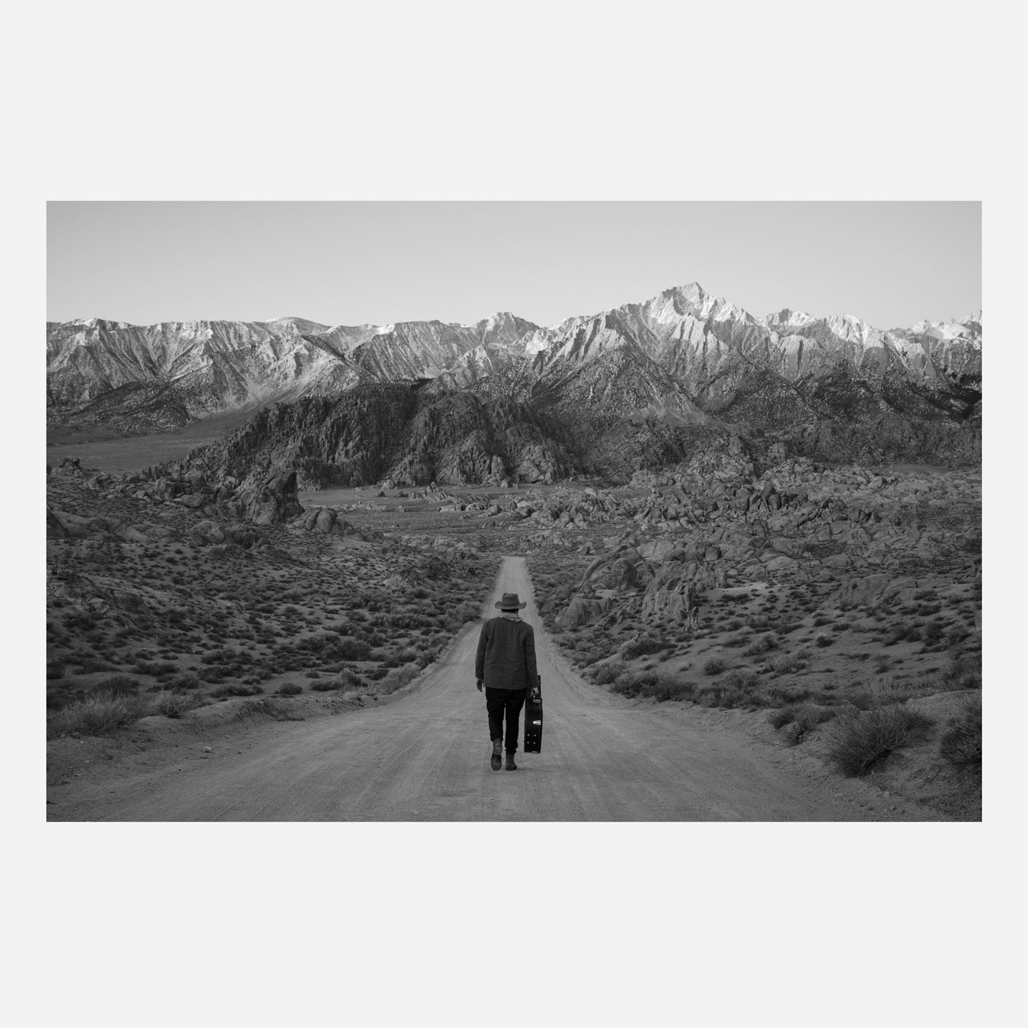 A lone musician embarks on a soul-stirring journey down a rustic dirt road, framed by the grandeur of a vast Alabama Hills and Sierra Nevada mountain range in the distance. As the musician strides forward with purpose, their silhouette against the backdrop of the rugged landscape exudes an aura of determination and introspection.