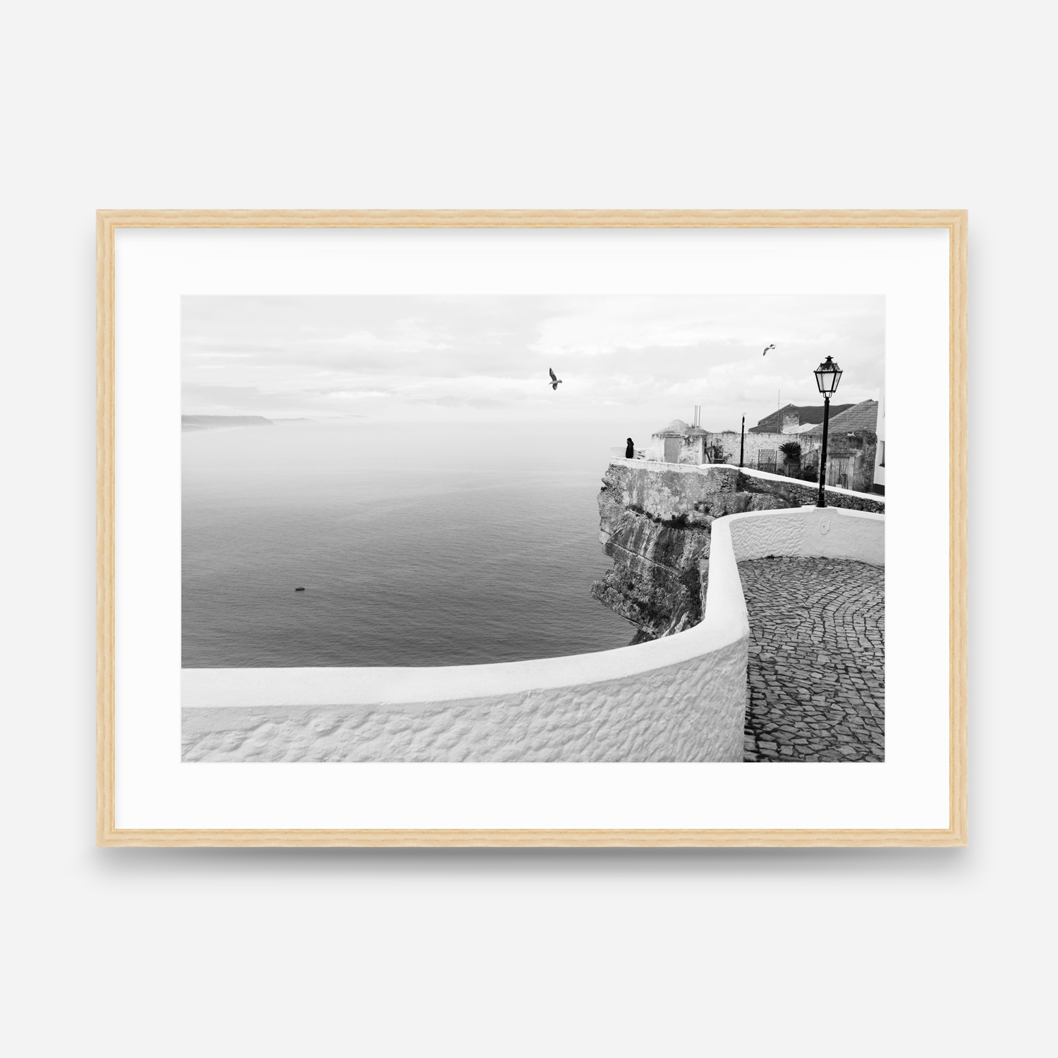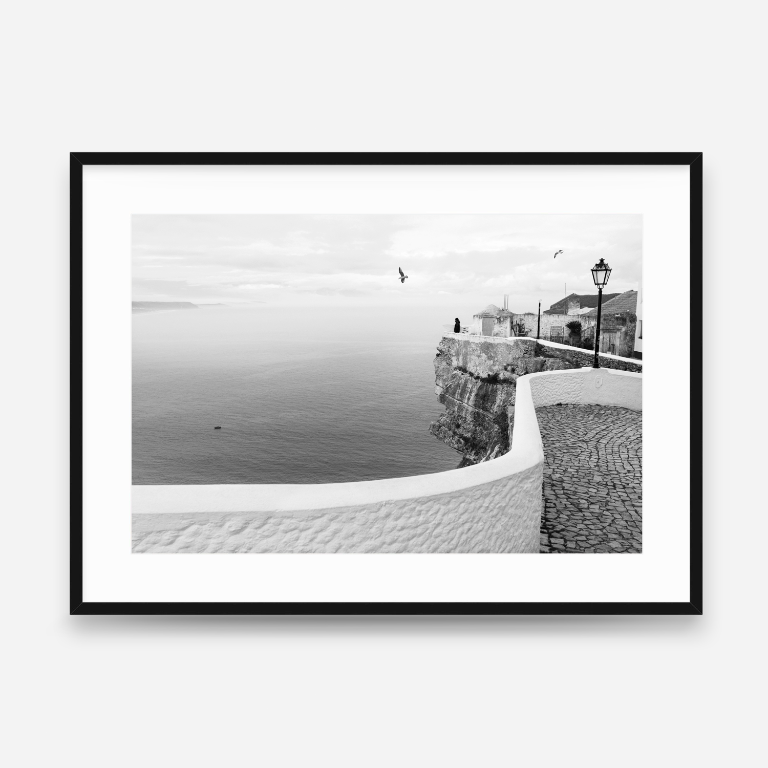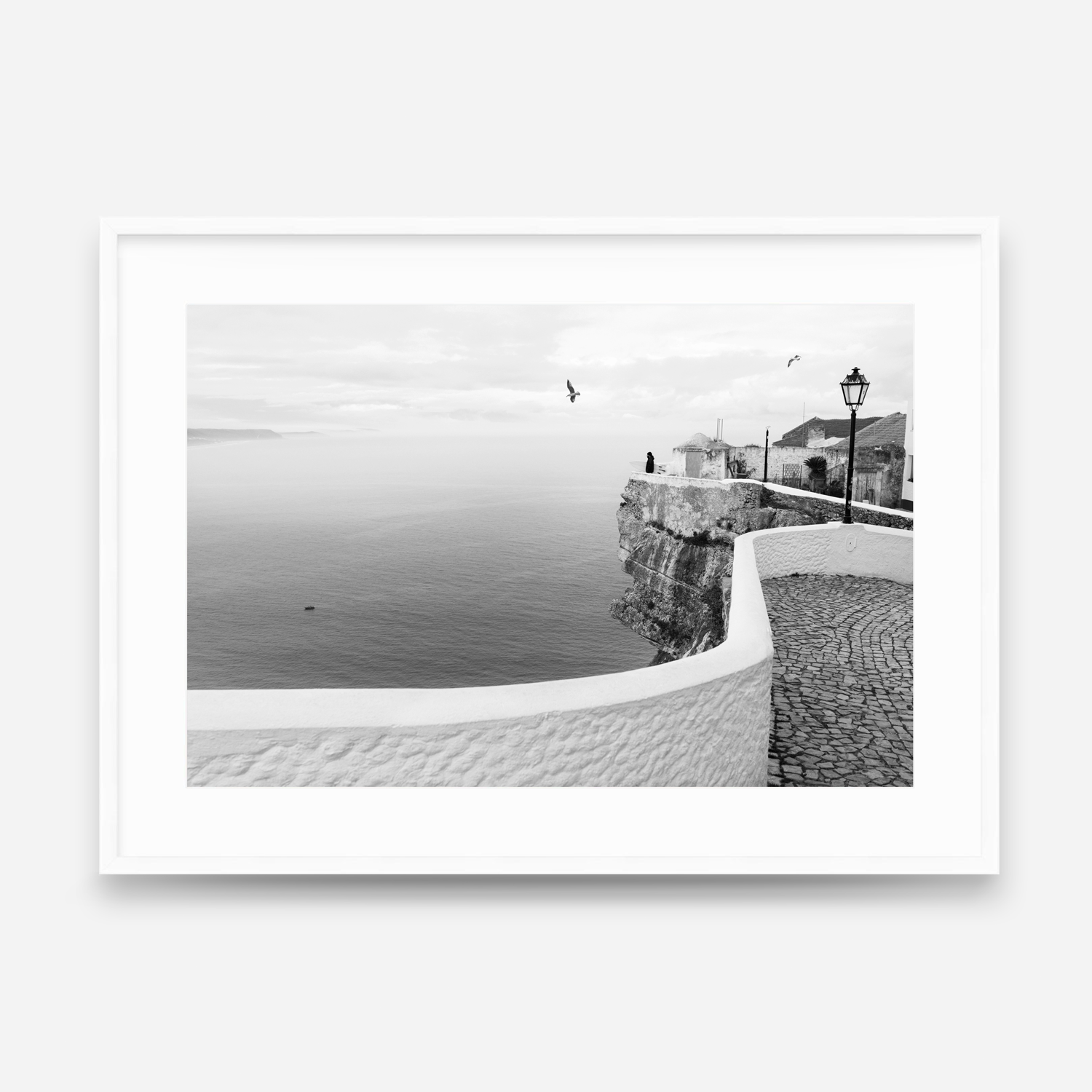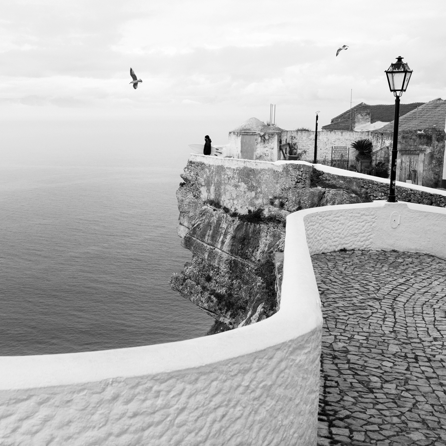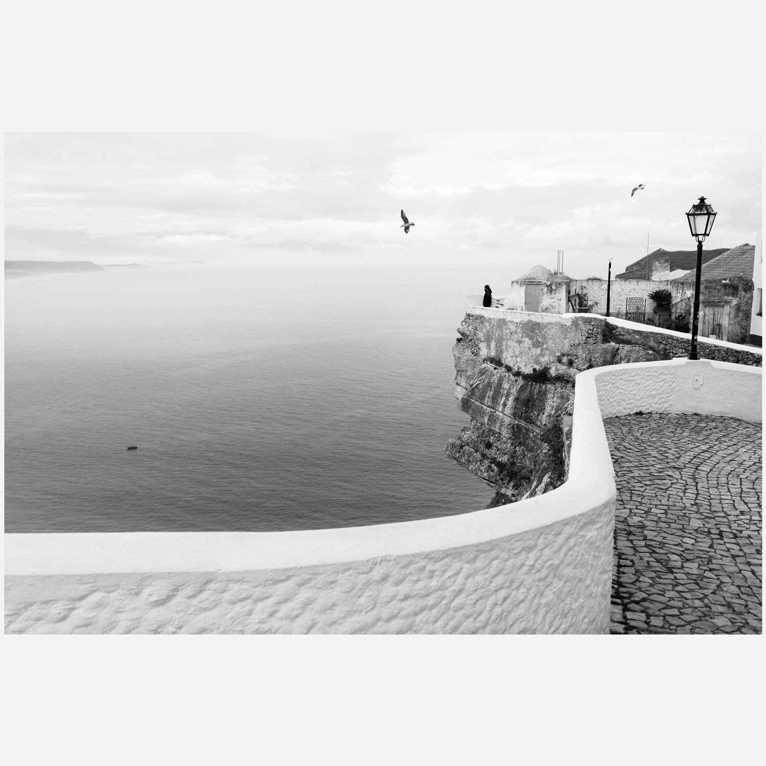 Captured during a quiet morning surf check in Nazaré, Portugal, this black-and-white photograph highlights the calm before the ocean awakens. The winding stone walkway, iconic cliffside architecture, and expansive horizon create a timeless coastal scene rooted in European surf culture. Minimal and refined, this print brings a sense of calm, wanderlust, and coastal charm to any space—perfect for modern, beach-inspired, or travel-focused interiors.