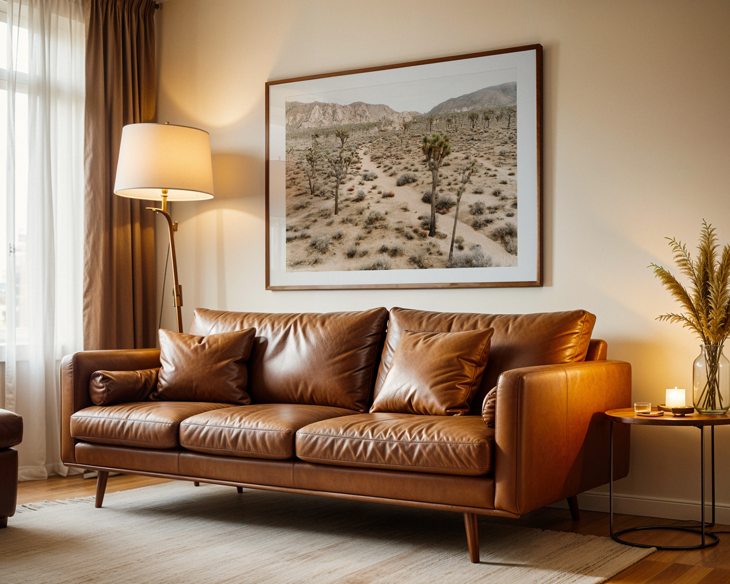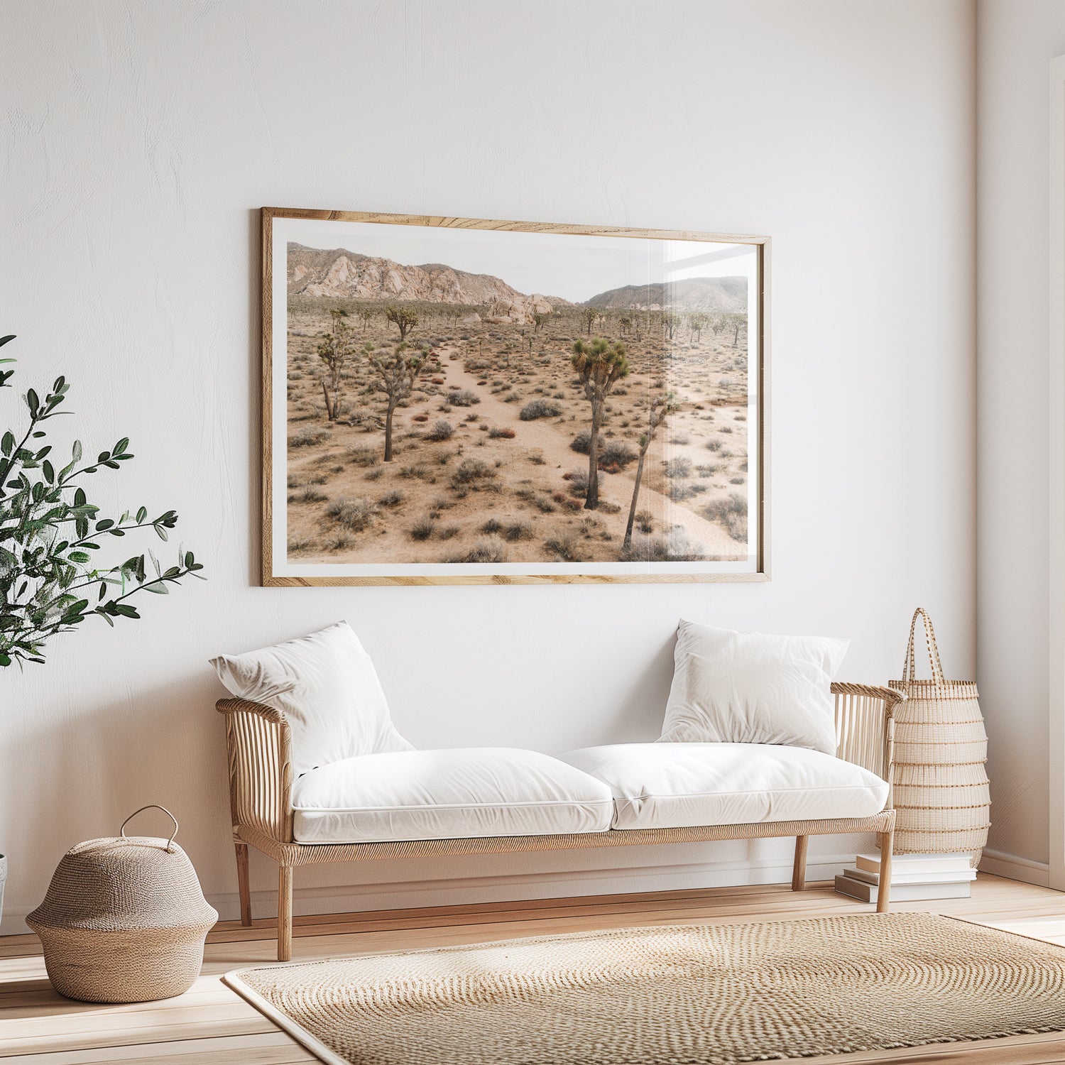 Captured in Joshua Tree National Park, this fine art photograph showcases the timeless beauty of the high desert. Soft earth tones, sculptural Joshua trees, and distant rocky formations create a serene and expansive landscape. Perfect for modern, neutral, and nature-inspired interiors, this print adds warmth and texture without overpowering the room.