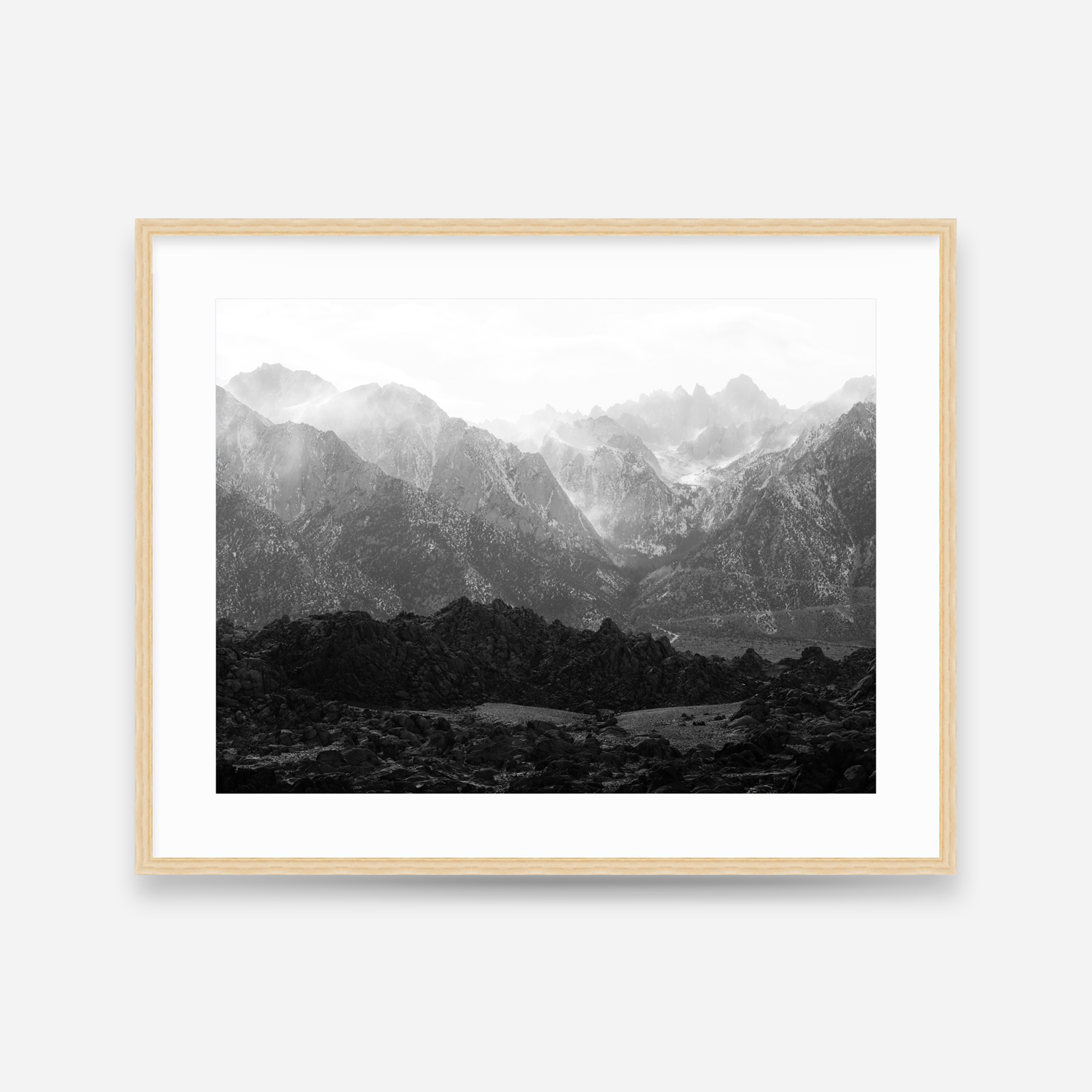 Experience the dramatic beauty of the Alabama Hills with this fine art black-and-white landscape print. Jagged rock formations rise from the desert floor, backed by the towering peaks of the Eastern Sierra. Sculpted by wind, time, and raw natural force, this scene captures the wild, untamed character of the American West. Perfect for adding depth, texture, and a sense of adventure to any modern, rustic, or minimal interior.