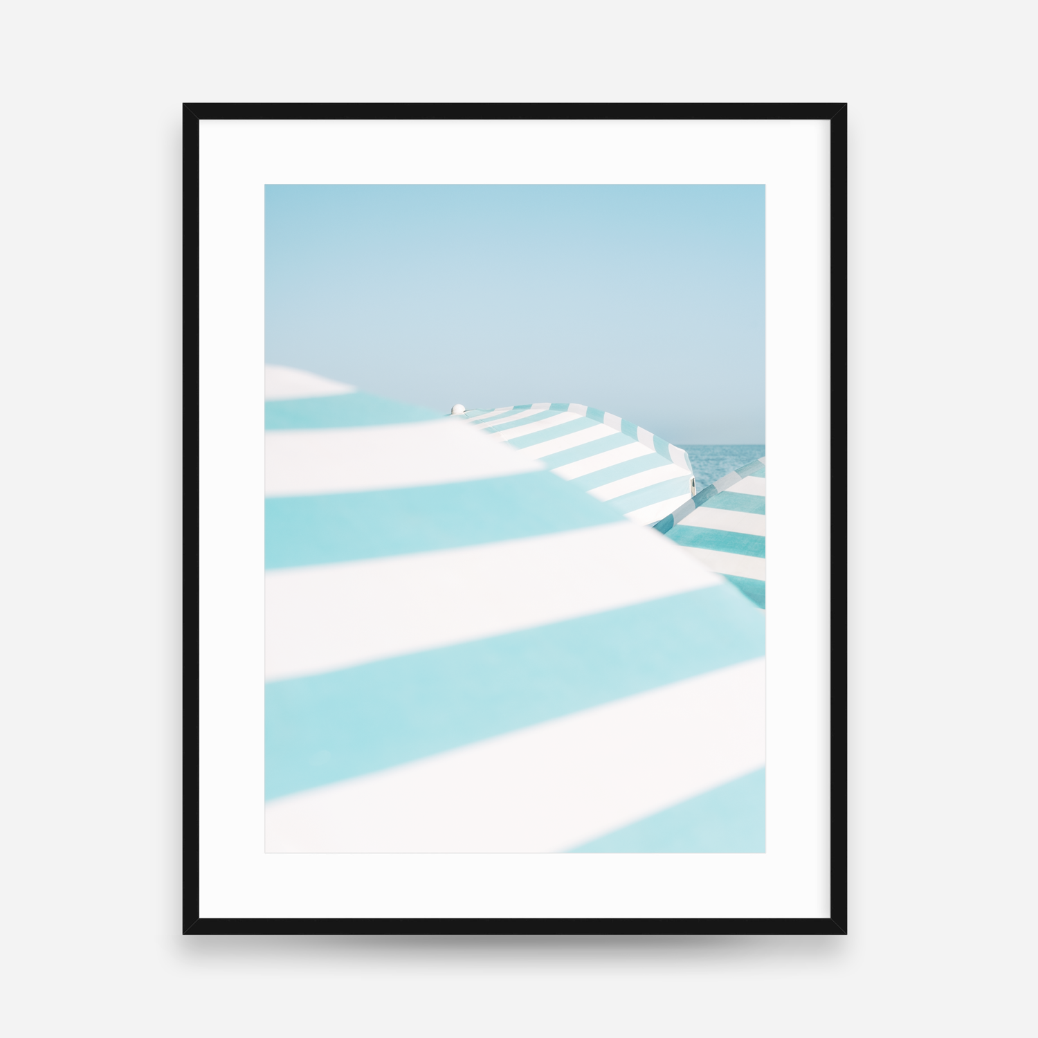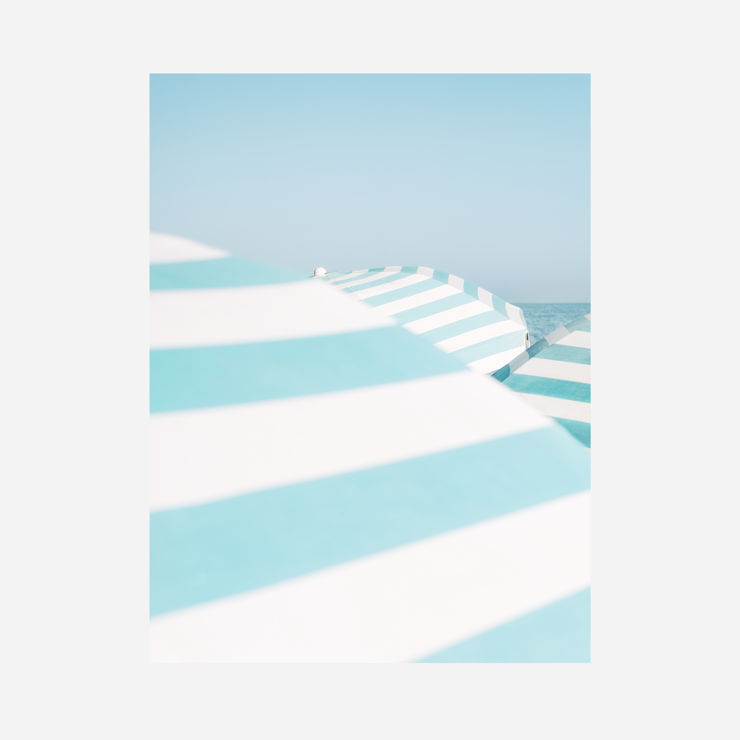 Bring the ease of a coastal weekend into your home with this Santa Barbara-inspired fine art print. Blue and white striped umbrellas form a modern, minimalist pattern against the soft Pacific horizon, adding a refreshing pop of coastal color.