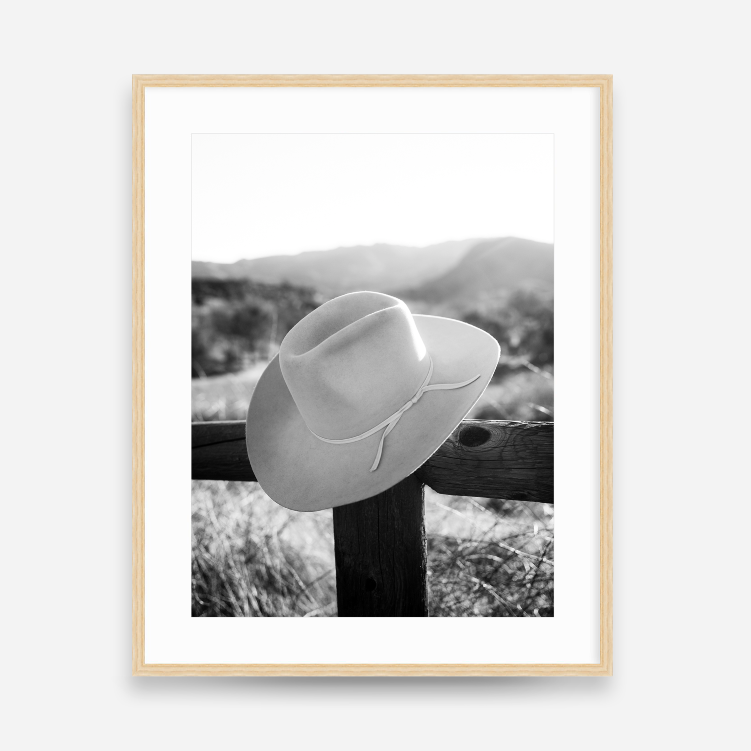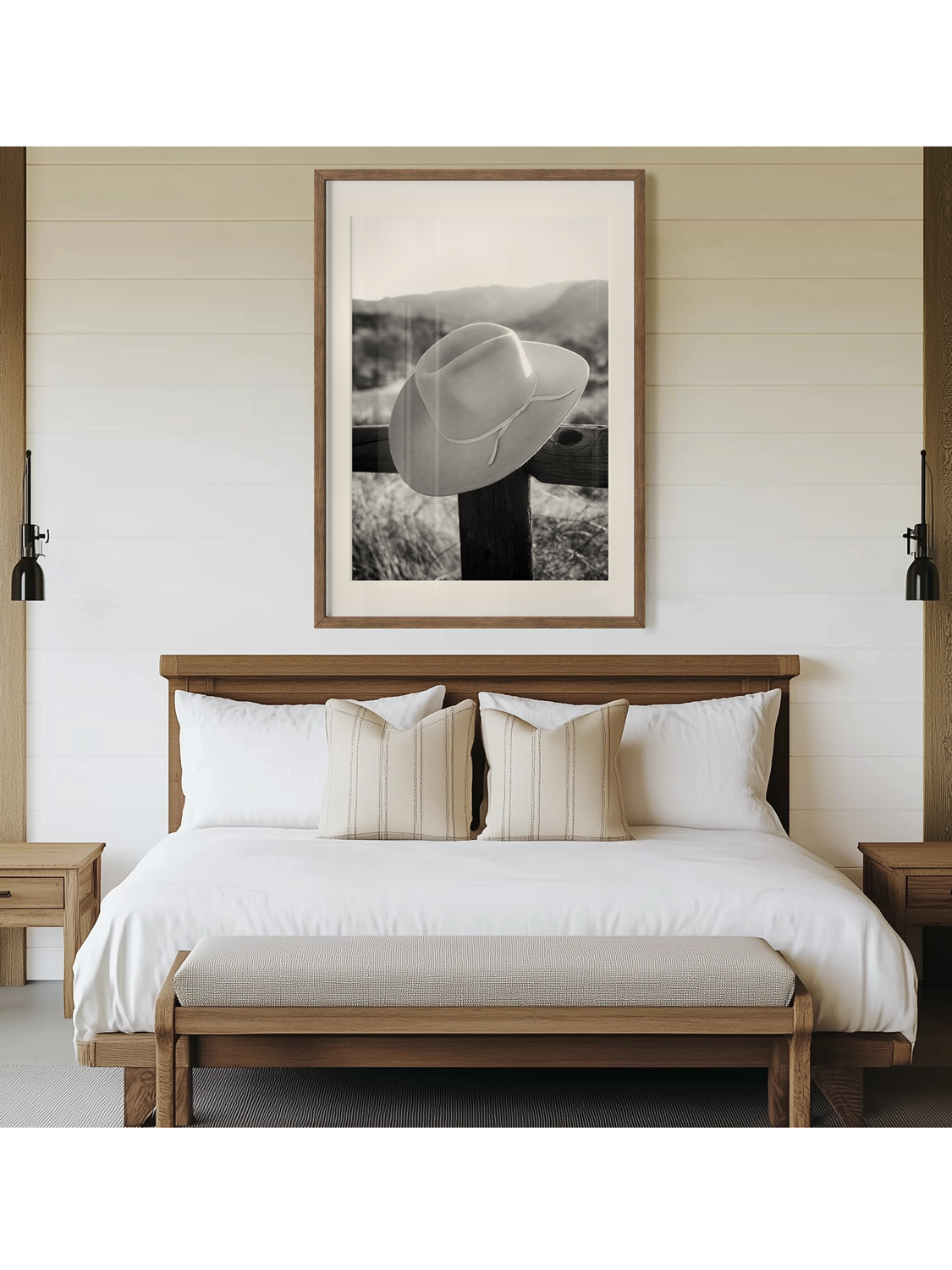 Bring the quiet warmth of the Santa Monica Mountains into your home with this fine art photograph of a cowboy hat resting on a weathered wooden fence. Shot in soft summer light, it captures the rugged simplicity and timeless western charm of California’s backcountry. Its neutral tones and natural textures make it a refined addition to modern, rustic, and minimal interiors.