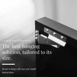 Every frame is sealed with kraft paper backing, protective bumpers, and equipped with the best hanging solution, tailored to its size.