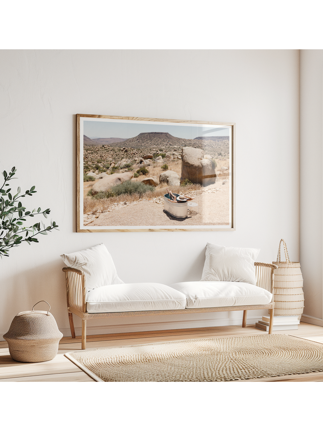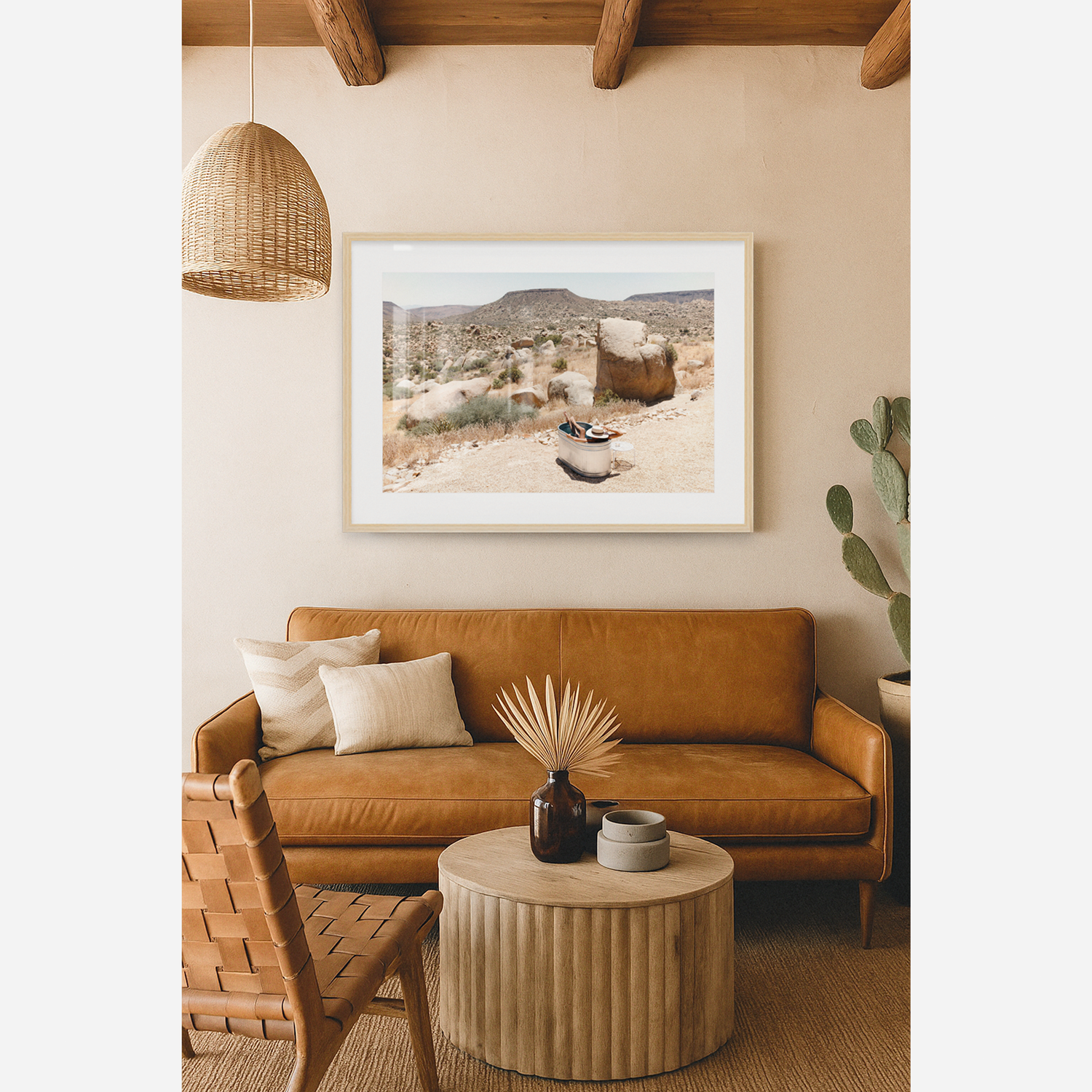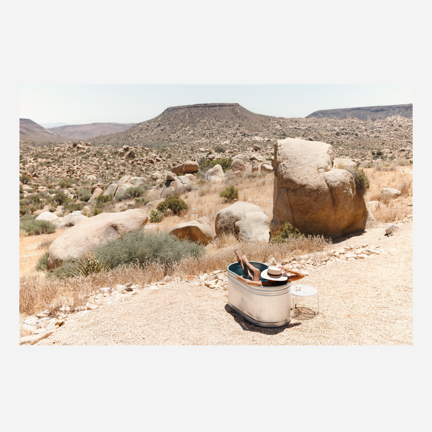 Experience the calm allure of Joshua Tree with Desert Heat, a fine art photograph that blends human stillness with the raw beauty of the high desert. Captured under a cloudless blue sky, the warm golden light enhances the rocky terrain and sun-washed earth, creating a scene that feels both peaceful and untamed. This framed print brings the quiet warmth of the Mojave into any space, making it a striking addition to modern, rustic, or desert-inspired interiors.