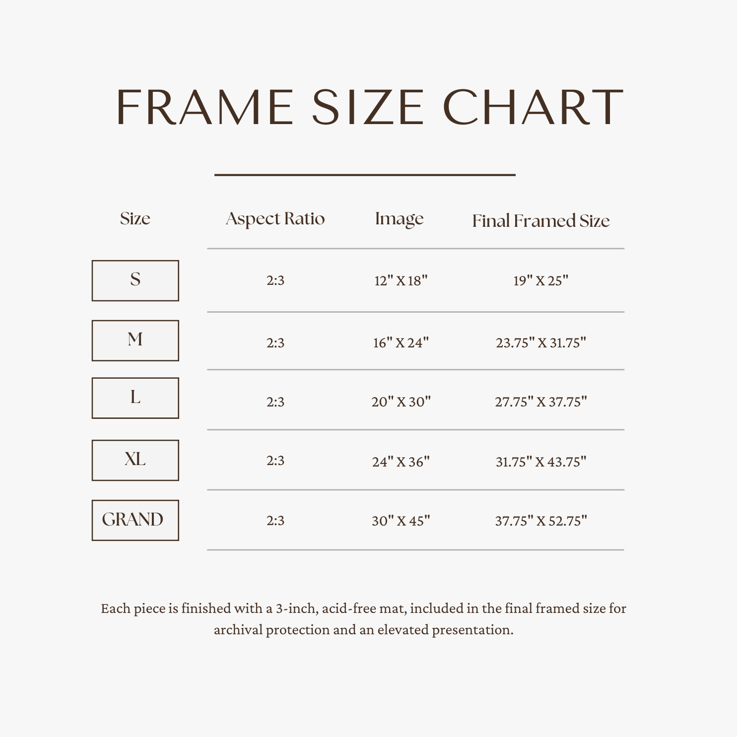 We surround our print with 4-ply mat boards. We use solid wood moulding, sourced from sustainably managed forests.