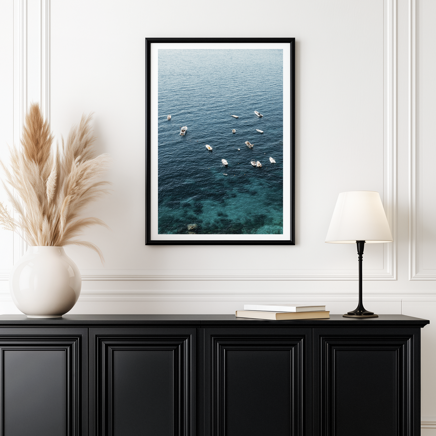 Captured along Italy’s iconic shoreline, the image transports you to a quiet Mediterranean oasis where crystal water, warm sunlight, and effortless coastal living meet. Perfect for interiors with soft, natural tones, this print adds a touch of refined coastal sophistication without overwhelming your space. A timeless piece for anyone who loves modern coastal décor, Mediterranean travel, and serene ocean views.